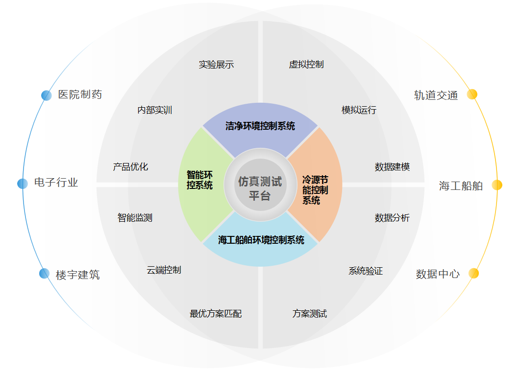 實驗室擁有潔凈環(huán)境控制系統(tǒng)仿真測試平臺、冷源節(jié)能控制系統(tǒng)仿真測試平臺、智能環(huán)控系統(tǒng)仿真測試平臺、海工船舶環(huán)境控制系統(tǒng)仿真測試平臺等適用于不同行業(yè)及應用的實驗臺。通過仿真模擬、數(shù)據(jù)分析、智能優(yōu)化等功能實現(xiàn)精準的控制策略研究,找到系統(tǒng)運行更優(yōu)方案,提高產品的性能和可靠性,從而為客戶提供穩(wěn)定、可靠、智能的系統(tǒng)解決方案??蓱糜谲壍澜煌ā⒅腔蹣怯?、電子潔凈、醫(yī)院制藥、數(shù)據(jù)中心、海工船舶等各個領域。