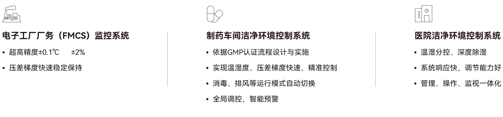 廣泛應(yīng)用于電子潔凈廠房、醫(yī)院潔凈手術(shù)室、ICU、NICU等凈化病房、食品加工廠房、GMP制藥企業(yè)與精密儀器制造工業(yè)廠房、化工潔凈廠房、精密實(shí)驗(yàn)室等行業(yè)凈化空調(diào)系統(tǒng),可實(shí)現(xiàn)系統(tǒng)溫濕度、風(fēng)量、潔凈度及壓差梯度的自動(dòng)調(diào)節(jié)及各種安全保護(hù)、聯(lián)鎖、節(jié)能運(yùn)行等控制功能,以最大限度地保證潔凈場(chǎng)所溫濕度、壓差的控制及精度要求。